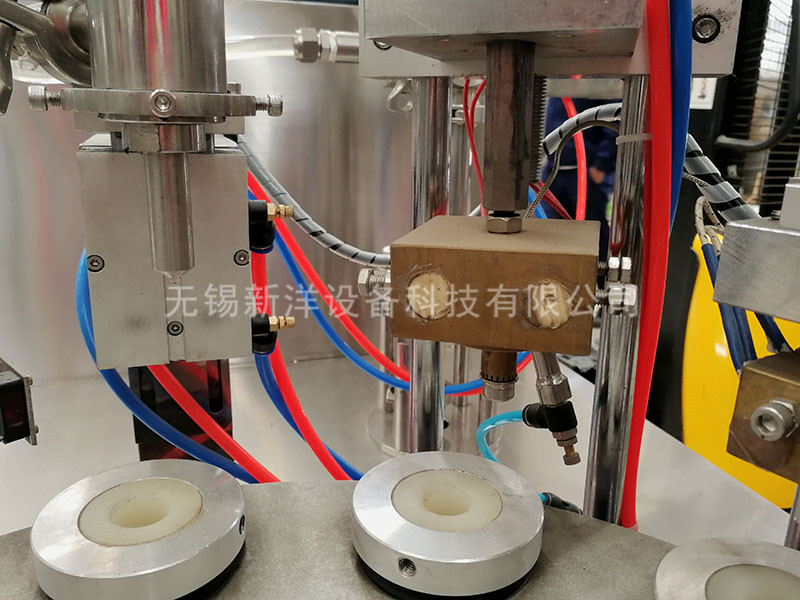 該機(jī)的灌裝、封口、壓齒、換位、定位等均采用機(jī)電、光電、氣泵一體化原理,通過凸輪分度機(jī)構(gòu),換位、定位,氣泵灌裝、封口等動(dòng)作完成,灌裝、加熱、封口、切尾、頂桿等七個(gè)工作程序。所有動(dòng)作均同一輸出同步完成。保證動(dòng)作一體化,提高了動(dòng)作的可靠性和穩(wěn)定性。