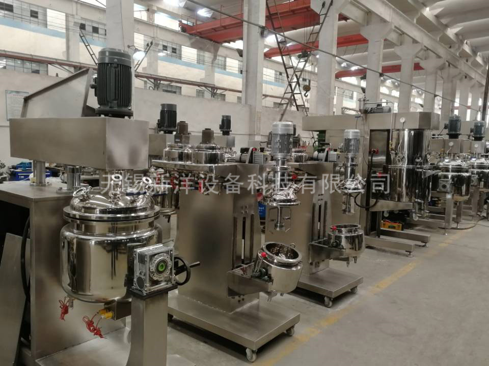 物料在水鍋、油鍋內(nèi)通過(guò)加熱、攪拌進(jìn)行混合反應(yīng)后,由真空泵吸入乳化鍋,通過(guò)乳化鍋內(nèi)上部的中心攪拌、聚四氟乙烯刮板始終迎合攪拌鍋形體,掃凈掛壁粘料,使被刮取的物料不斷產(chǎn)生新界面,再經(jīng)過(guò)葉片的剪斷、壓縮、折疊,使其攪拌、混合而向下流往鍋體下方的均質(zhì)器處,物料再通過(guò)高速旋轉(zhuǎn)的切割輪與固定的切割套之間所產(chǎn)生的強(qiáng)力的剪斷、沖擊、亂流等過(guò)程,物料在剪切縫中被切割,迅速破碎成200um-0.2um的微粒,由于乳化鍋內(nèi)處于真空狀態(tài),物料在攪拌過(guò)程中產(chǎn)生的氣泡被及時(shí)抽走。采用抽真空的方式,使所生產(chǎn)的制品在攪拌過(guò)程中不再混入氣泡,從而保證可制造出富有光澤、細(xì)膩及延展性良好的產(chǎn)品。